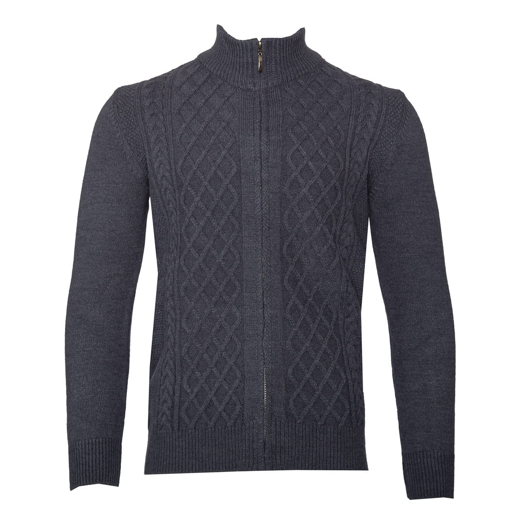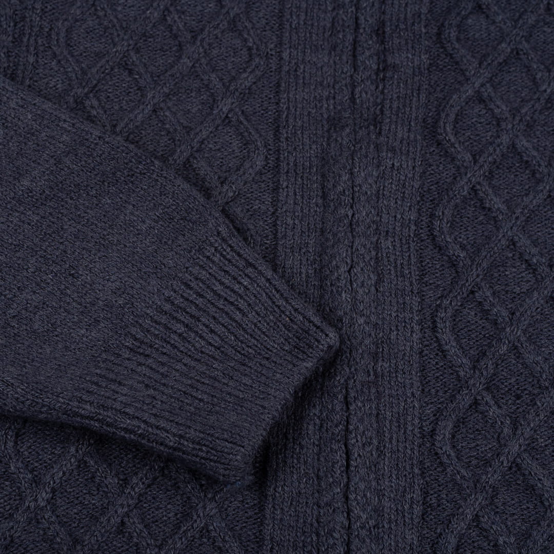 Stylowy sweter męski w kolorze indygo wykonany z wysokiej jakości dzianiny z dodatkiem 30% wełny, która zapewnia optymalny komfort cieplny w chłodniejsze dni. Klasyczny splot warkoczowy nadaje swetrowi elegancki i ponadczasowy charakter, idealny zarówno do codziennych, jak i bardziej formalnych stylizacji.